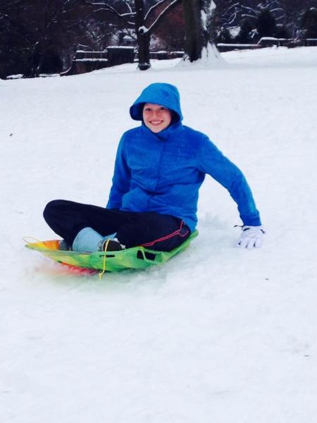 East Liberty Family Health Care Center's member for 2014-2015, Kirsten Franklin, plays in the Pittsburgh snow.